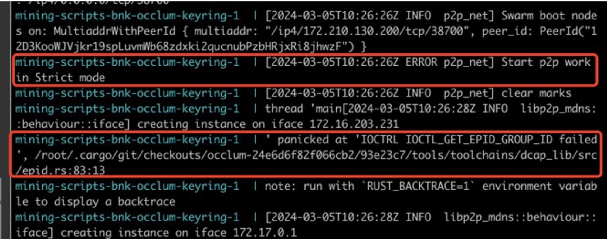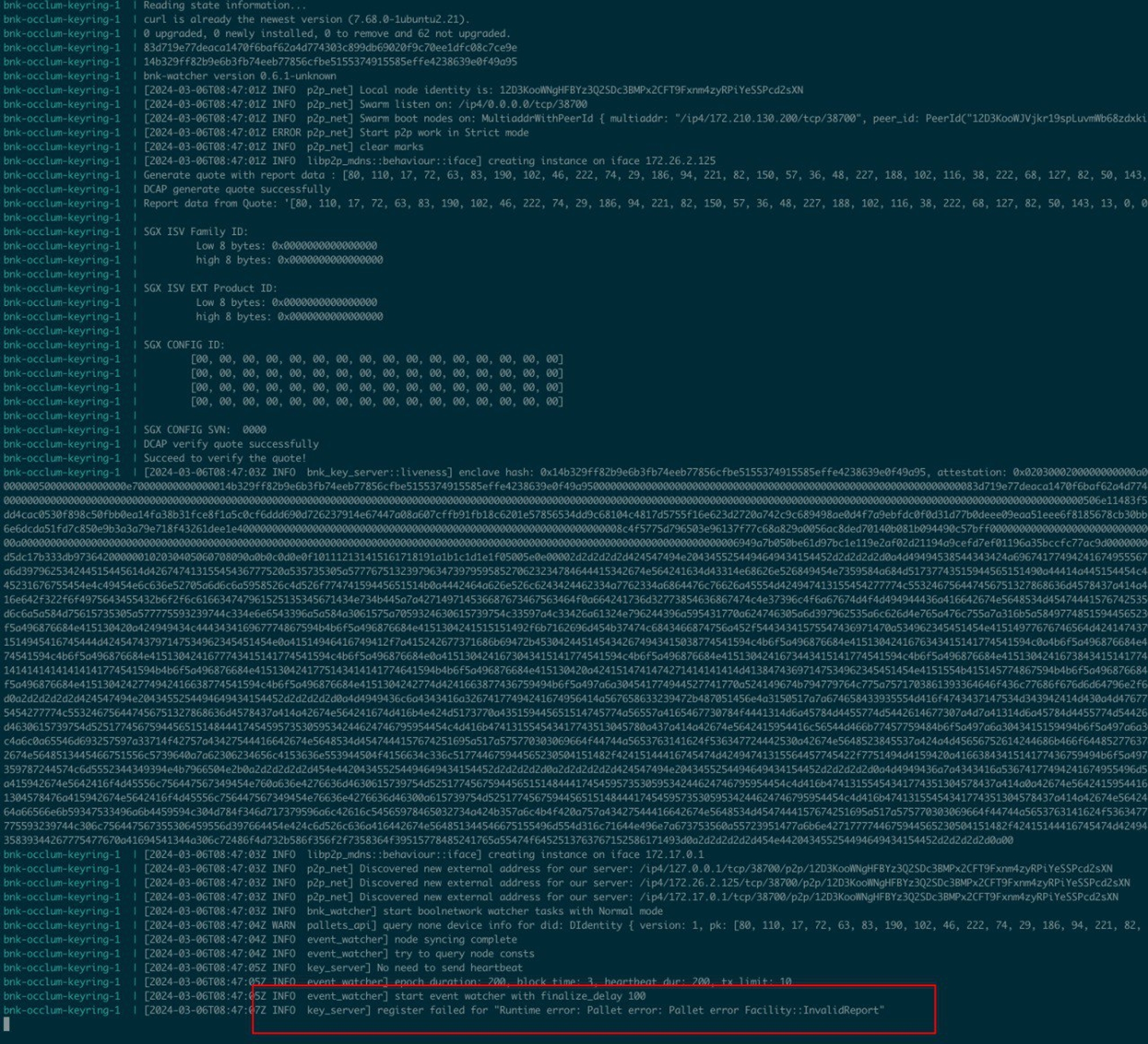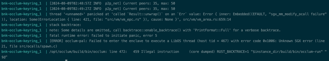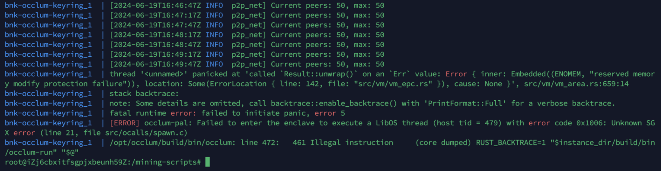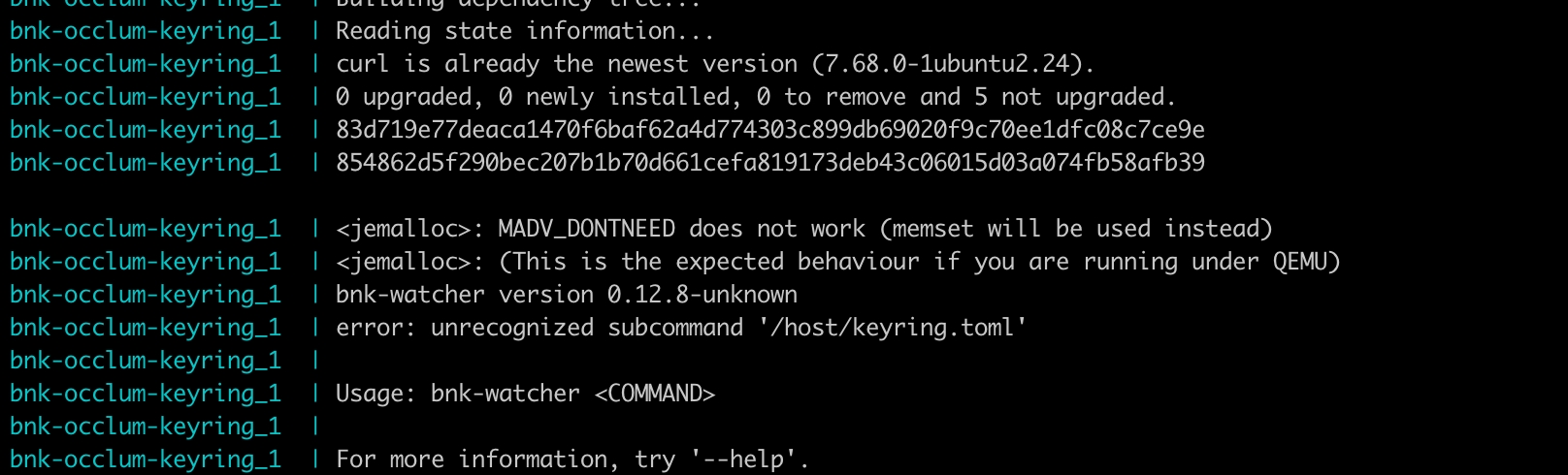 For images with versions greater than v0.12.8, you need to add the run command to the startup command line, for example occlum run /bin/bnk-watcher run /host/keyring.toml.