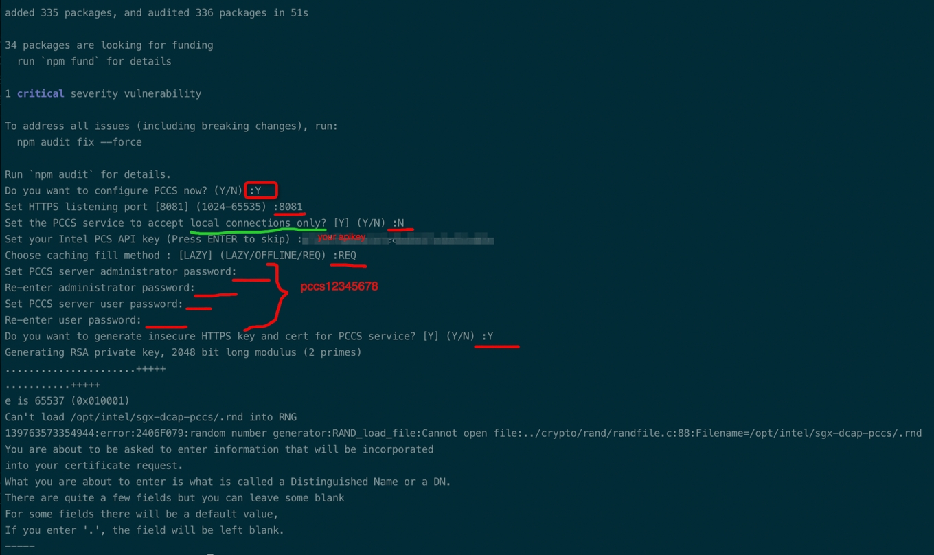 During the installation process, enter the API key you applied for earlier, and set a password for PCCS. Here, we will use "pccs12345678" as an example.